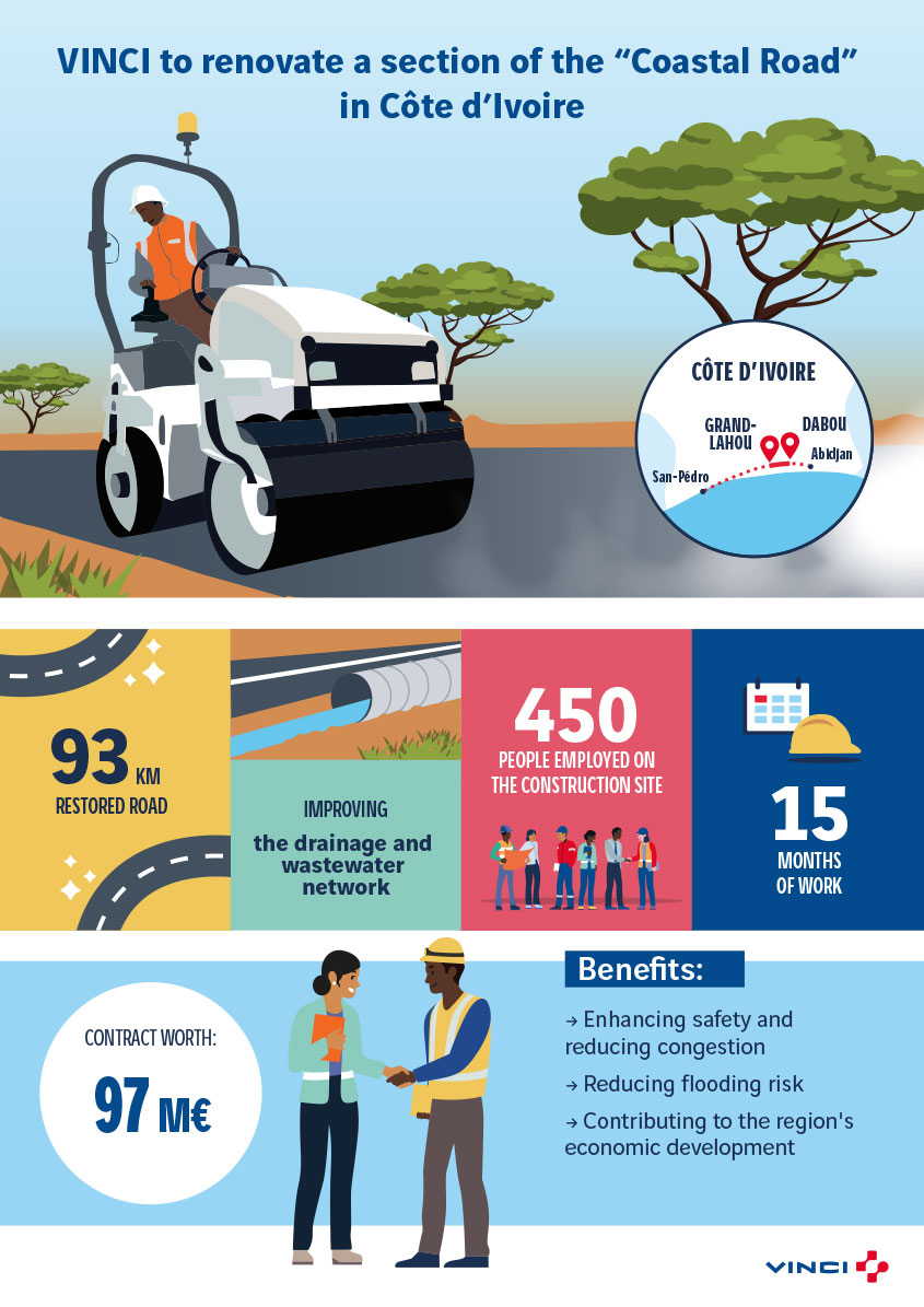 VINCI Construction, through its subsidiary Sogea-Satom, was selected by the Côte d’Ivoire Ministry of Equipment and Road Maintenance to restore a stretch of the “Coastal Road" between Dabou and Grand Lahou, connecting the country’s two main port cities (Abidjan and San Pedro).