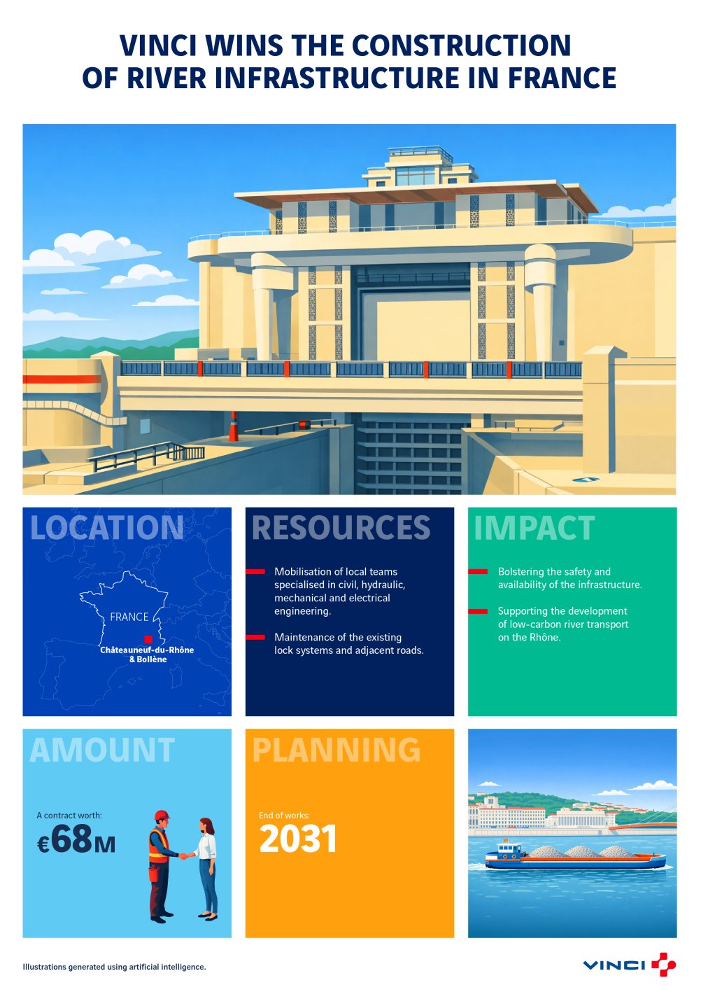 The €68 million project will begin in March 2026 and is scheduled to last for five years. VINCI’s share of the work is valued at €45 million. The improvements will bolster the safety and availability of the infrastructure, thereby supporting the development of low-carbon river transport on the Rhône.