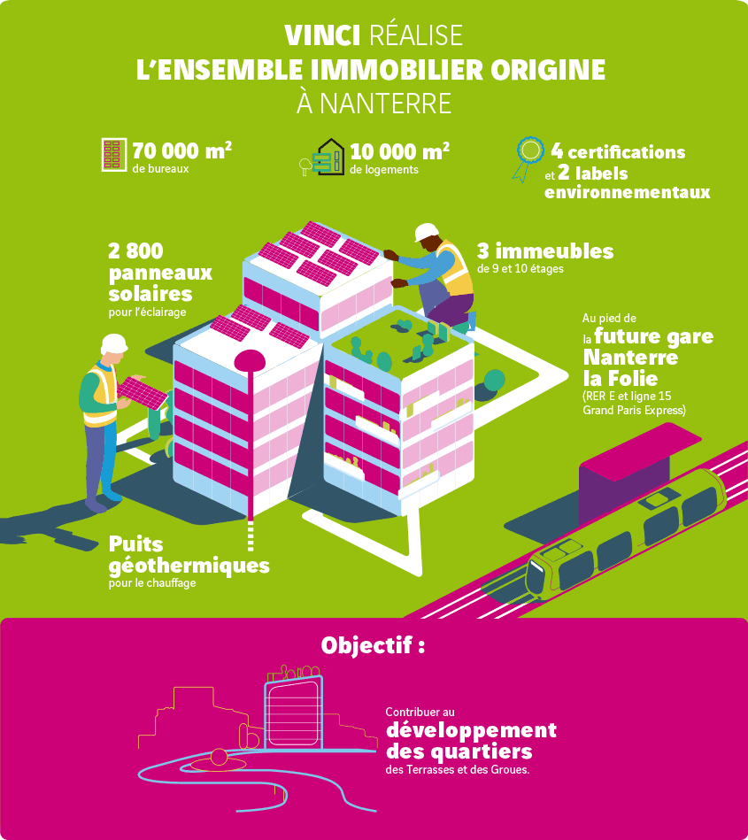 VINCI Construction France vient de démarrer les travaux de construction de l’ensemble immobilier Origine, à Nanterre, pour le compte d’ICADE. Ce nouveau projet se situe au cœur du Quartier des Terrasses, en face du futur Quartier des Groues. Les travaux sont menés par VINCI Construction France avec VINCI Energies pour la mise en œuvre des certificats et labels de performance environnementale des bureaux et s’achèveront à l’automne 2020.