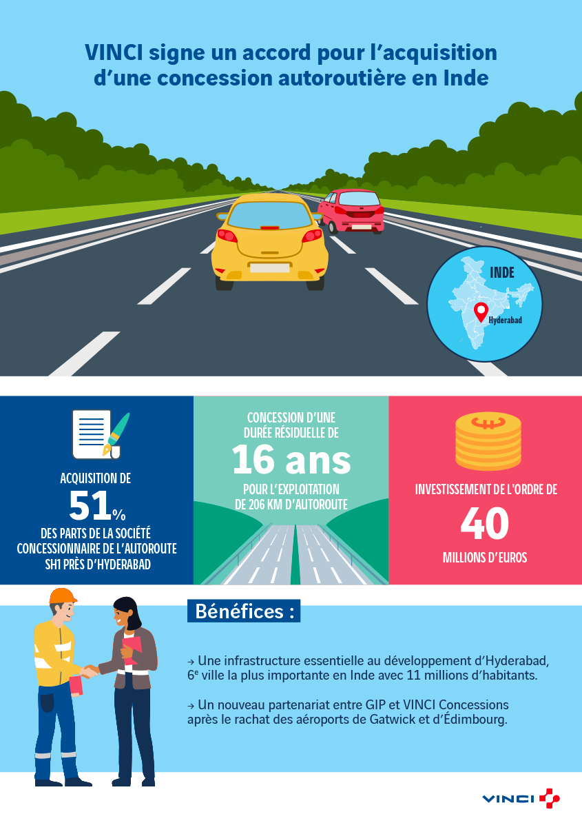 VINCI Highways, filiale de VINCI Concessions, a signé un accord portant sur l'acquisition de la société « HKR Roadways Limited », titulaire d’un contrat prenant fin en 2041 avec le gouvernement de l’État du Telangana pour la concession de l’autoroute SH1. Au closing financier, l’investissement de VINCI Highways dans cette transaction sera de l’ordre de 40 millions d’euros.