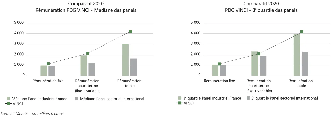 En matière de rémunération totale, approximativement 4,2 millions d'euros pour le PDG de VINCI, environ 4,0 millions d'euros pour celui de Médiane Panel industriel France et environ 2,2 millions d'euros pour le Médiane Panel sectoriel international.