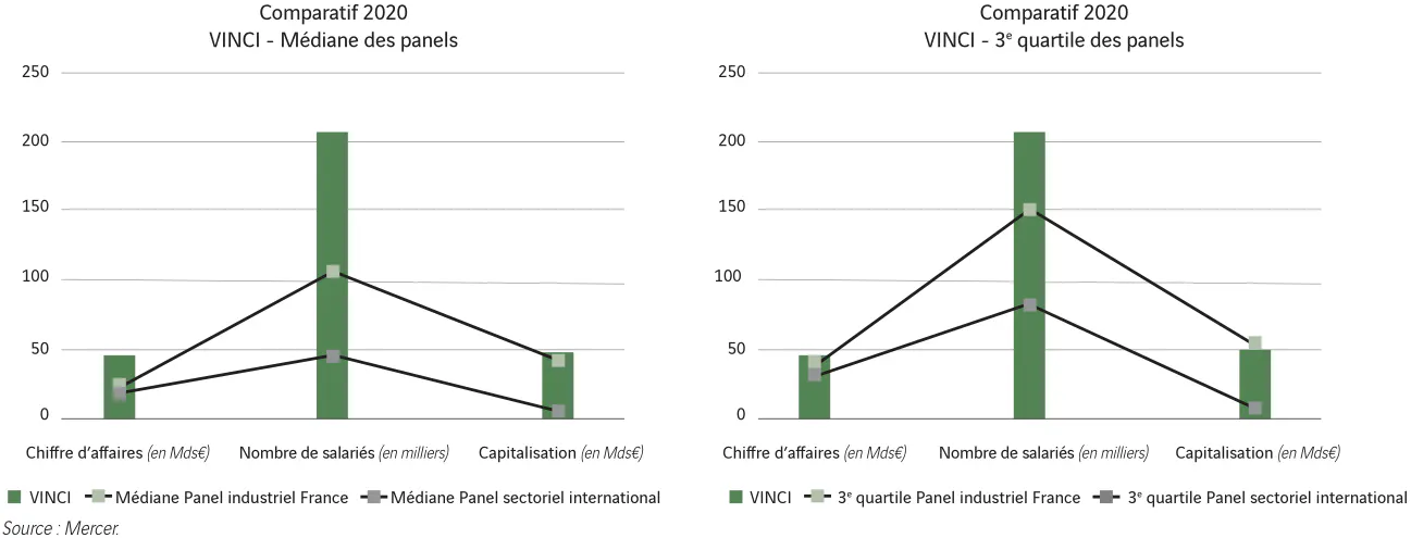 À cet effet, le comité des Rémunérations a retenu deux panels, l’un composé de 17 sociétés industrielles françaises membres de l’indice CAC 40 (Panel industriel France), l’autre de 11 sociétés européennes opérant dans la construction et les concessions d’infrastructures (Panel sectoriel international).