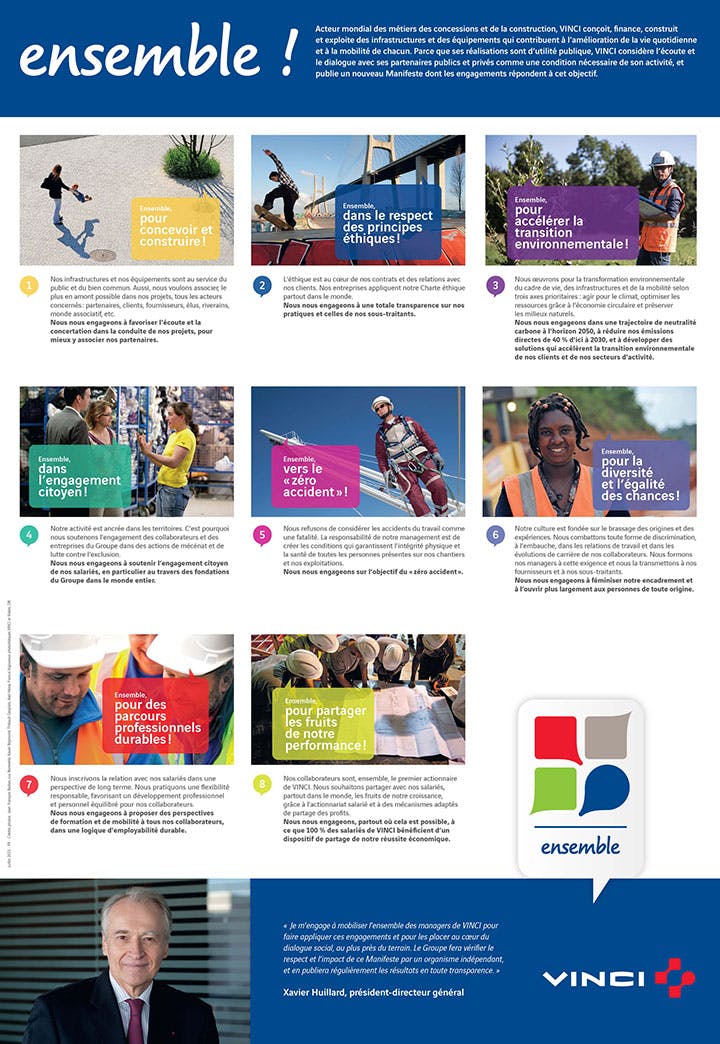 — Cette vision est synthétisée par le Manifeste VINCI, qui exprime les valeurs partagées par tous les collaborateurs et formalise les engagements de performance globale du Groupe, vis-à-vis de l’ensemble de ses parties prenantes. Édité en une trentaine de langues, le Manifeste est un vecteur transverse de cohésion entre les différentes activités de VINCI, et vise à aligner les actions de ses entités opérationnelles et de leurs équipes dans tous ses pays d’opération.