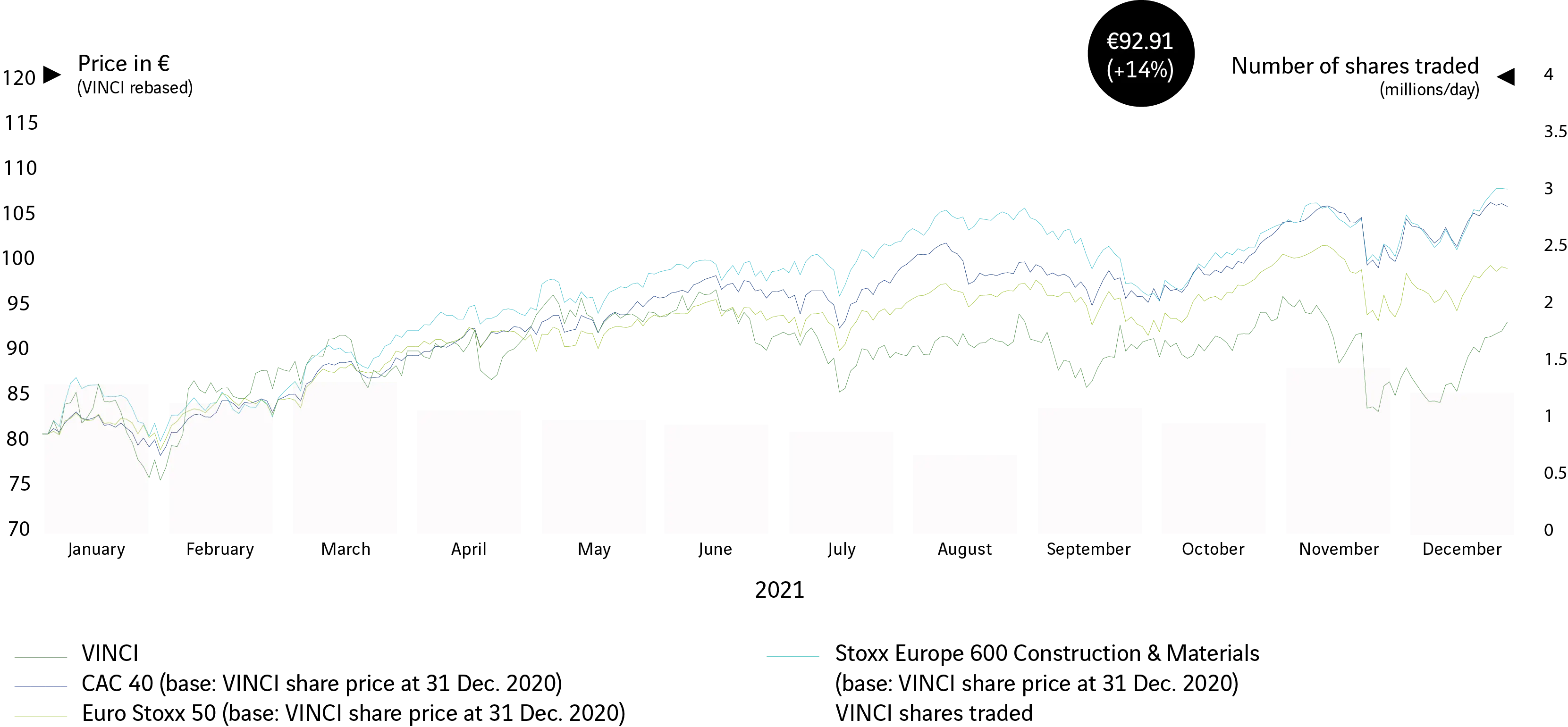 Market capitalisation at 31 December 2021: €55 billion based on a price of €92.91 per share, ranking VINCI 15th in the CAC 40. Between 31 December 2020 and 31 December 2021, the VINCI share rose 14%.