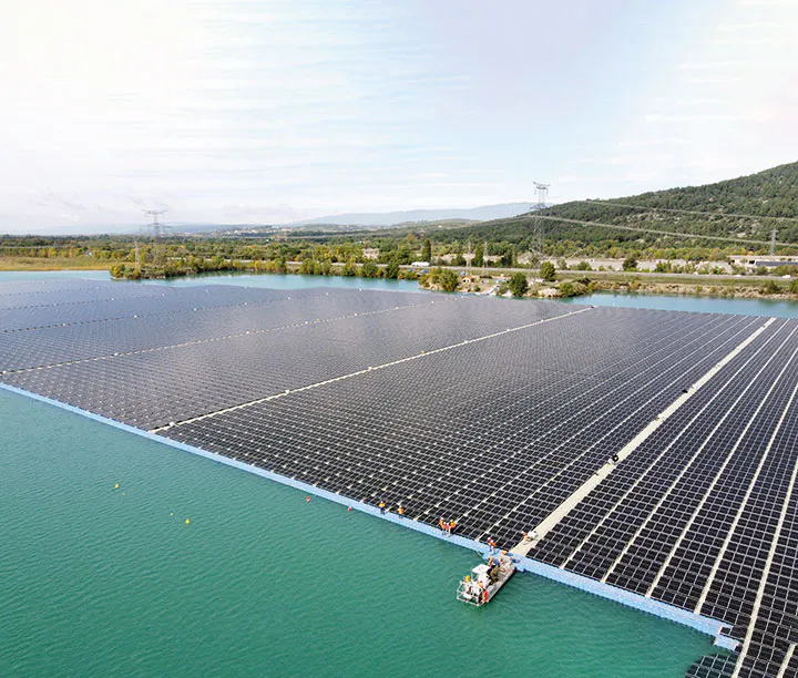 Installation of a floating solar farm on a lake over a former quarry in Peyrolles-en-Provence (south-east France).