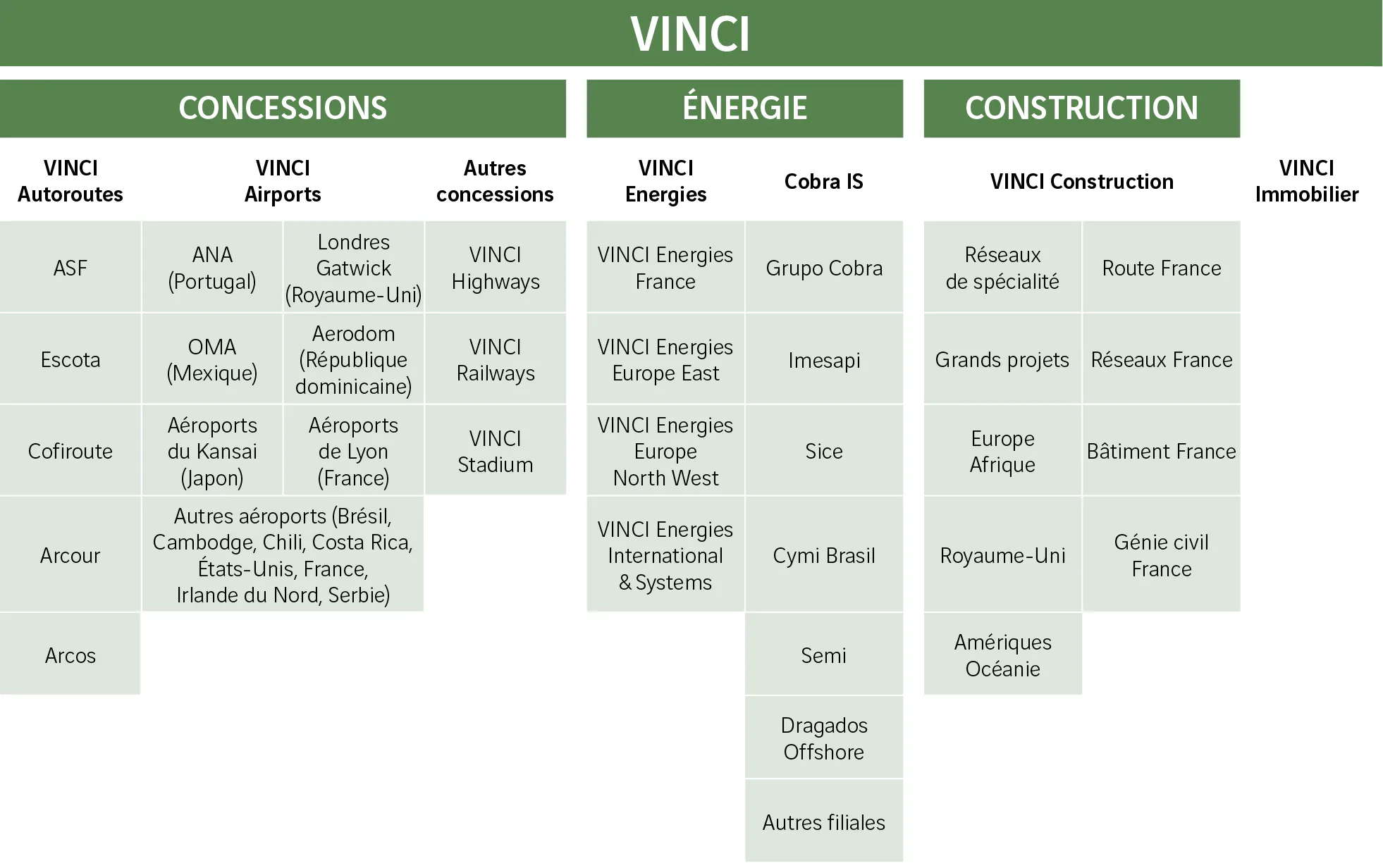 VINCI, qui est la société en elle-même, a trois filiales. Concessions, Énergie et Construction.