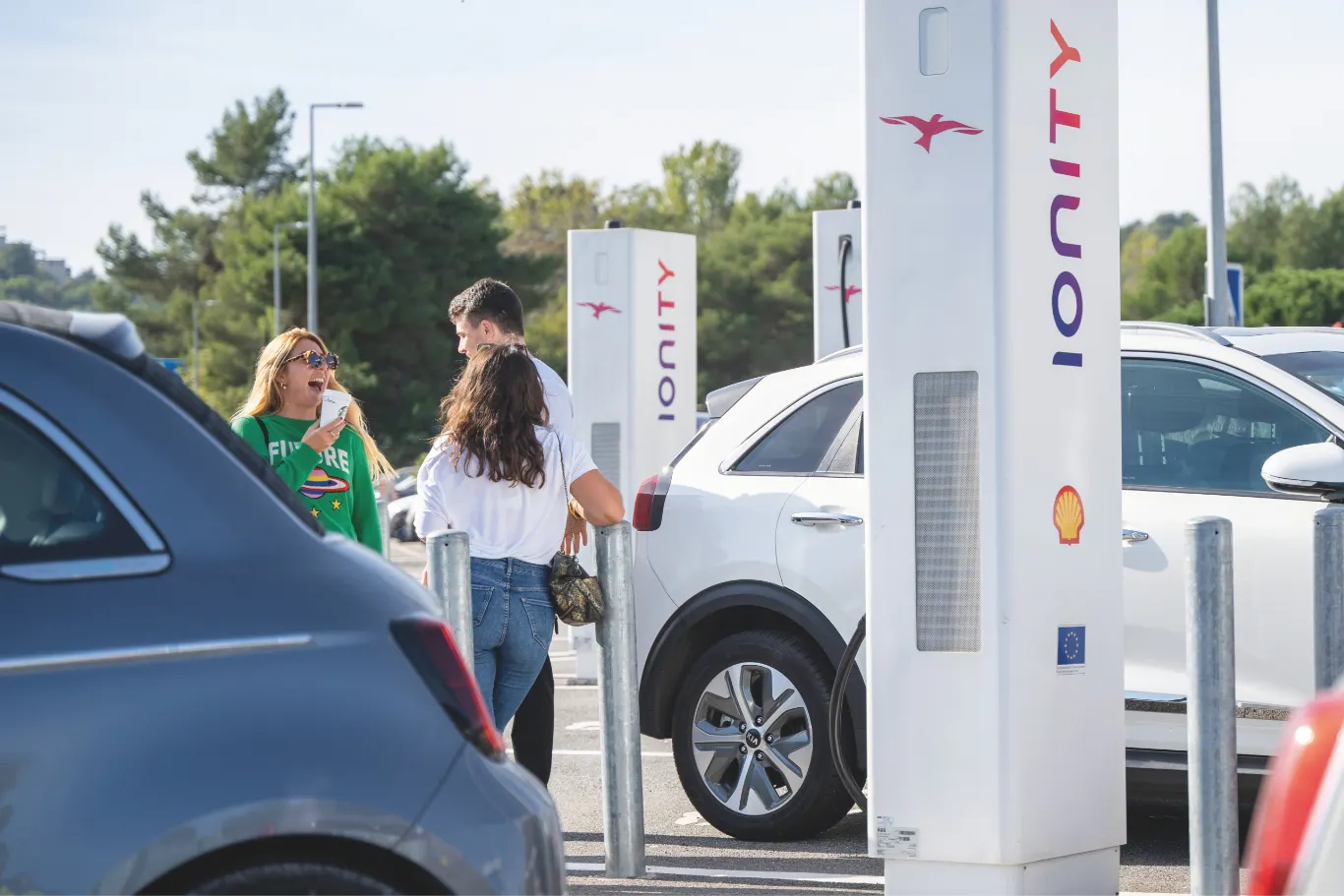 1 Station de recharge haute puissance Ionity sur l’aire de Bréguières Nord (A8), dans les Alpes-Maritimes, entre Nice et Mandelieu.