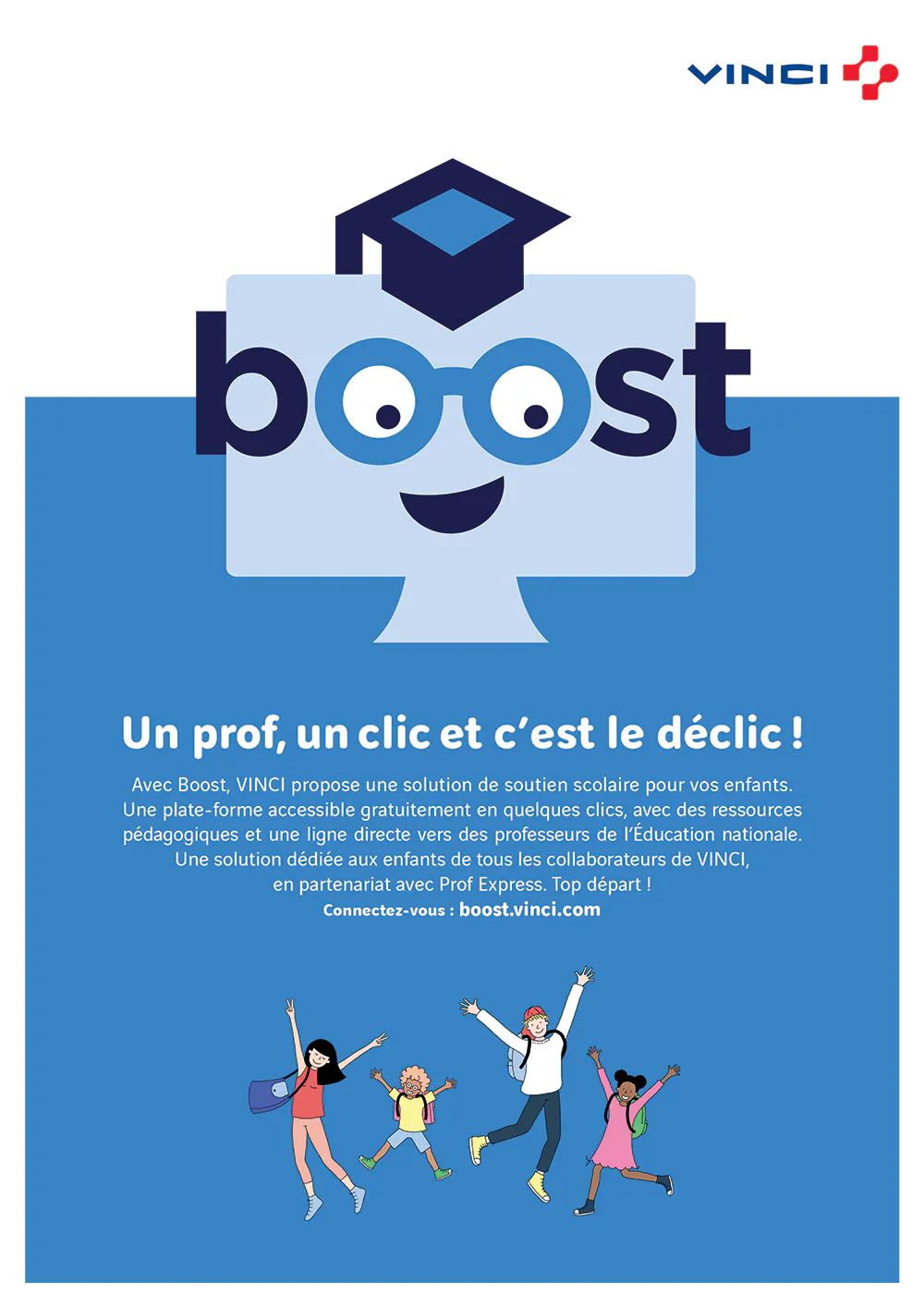 VINCI propose à tous ses collaborateurs en France une solution de soutien scolaire en ligne entièrement gratuite pour leurs enfants, du CP au BTS, développée en partenariat avec Prof Express, numéro un français du secteur. 8 000 enfants de salariés en ont bénéficié depuis la rentrée 2022.
