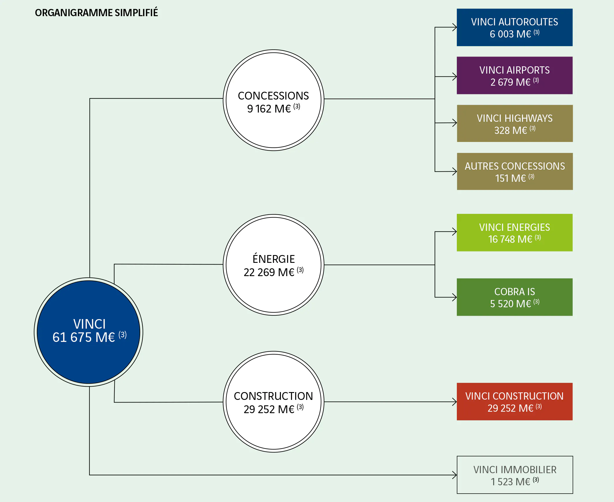 Le chiffre d'affaires de VINCI s'élève à 61 675 M€ (3) divisé en 3 branches différentes.
