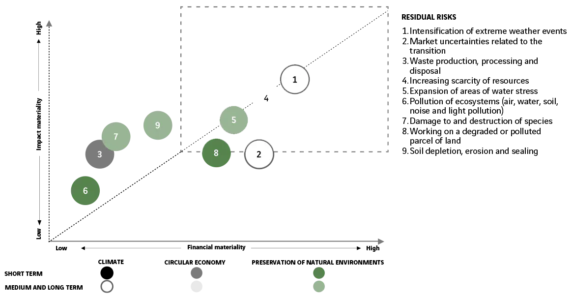 To identify the residual risks mapped below, gross risks were assessed according to their severity and probability of occurrence for the Group, which was reduced in proportion to the level of management of the risk. These risks were plotted according to their time horizon: short-term (less than five years) or medium/long-term (more than five years).