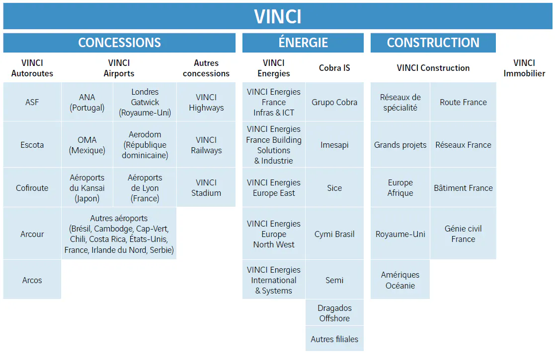 (*) Organigramme opérationnel simplifié du Groupe au 31 décembre 2023. Les différentes filiales qui composent le Groupe et le pourcentage d’intérêt de VINCI (direct et indirect) dans ces entités sont présentés dans la liste des sociétés consolidées disponible sur le site Internet du Groupe : www.vinci.com