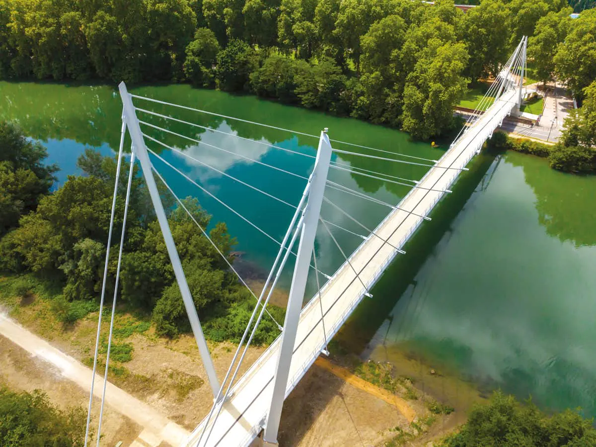 2 C’est pour mieux rejoindre l’île du Ramier, à Toulouse, que les équipes des divisions Génie civil France et Réseaux de spécialité ont livré en 2024 la passerelle Empalot – rebaptisée Anita Conti –, ouvrage haubané de 140 m de portée.