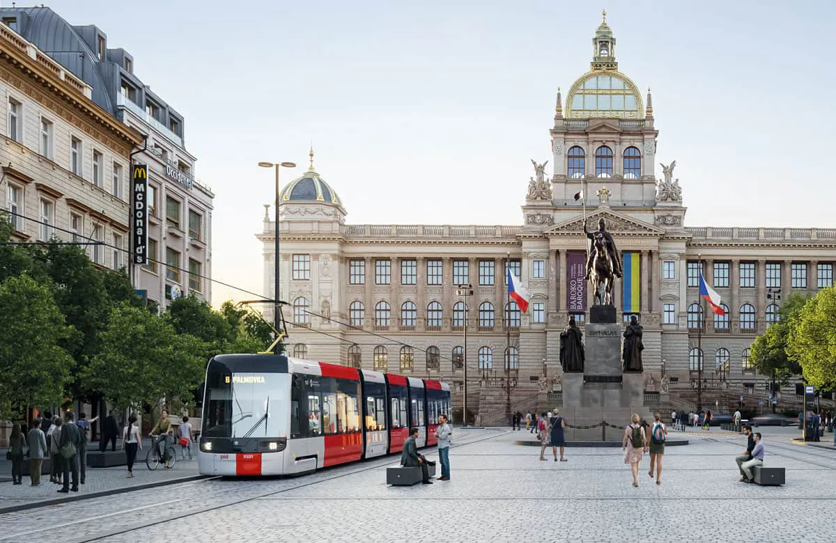 Aménagement de nouvelles voies de tramway place Venceslas à Prague, en République tchèque.