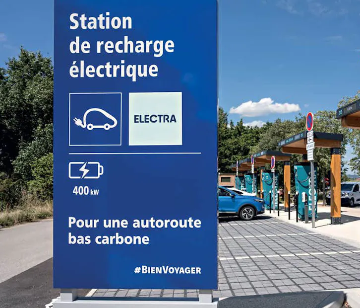1Station de recharge électrique sur l’aire de repos de Bornaron (A7), dans la Drôme.