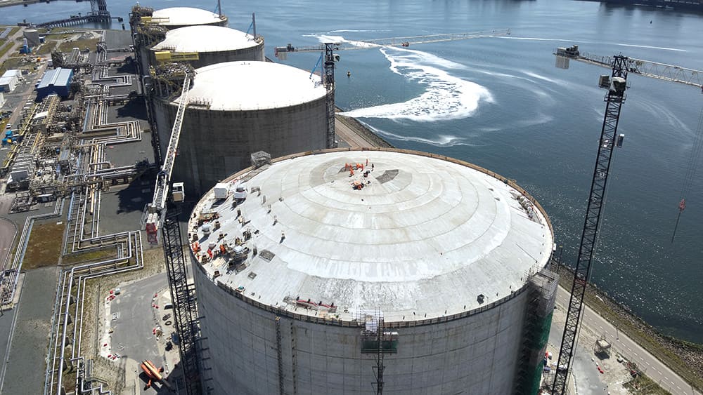 Après avoir livré trois réservoirs de gaz naturel liquéfié d’une capacité de 180 000 m³ chacun sur le port de Rotterdam, VINCI Construction réalise actuellement, dans le cadre du projet GATE (Gas Access to Europe) , un quatrième réservoir (photo ci-contre). L’objectif : contribuer à sécuriser l’approvisionnement en gaz du nord de l’Europe. L’entreprise mène des projets similaires dans d’autres États, comme en Angleterre, où elle construit un réservoir de 190 000 m³ sur l’île de Grain, renforçant la capacité de stockage de gaz du pays.